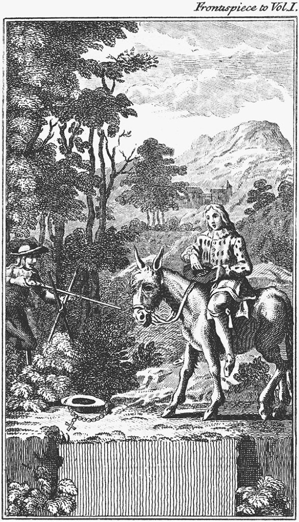 This frontispiece to the first volume of Smollett’s translation of Le Sage’s Gil Blas shows the hero first setting out on his adventures, when he is assailed by a decayed soldier who demands charity by levelling a firearm at Gil Blas. The hero gives him a small amount of money before hastily moving on. The episode sees a mixture of comedy and compromised compassion, with the hero’s mule adding comic effect. The illustrated scene is partly static, aiming towards naturalistic depiction of the characters, but with some effort towards dynamically capturing the combination of danger and comedy present in the text. As Gil Blas reflects, ‘I did not look upon this adventure as a very favourable omen for my journey’.