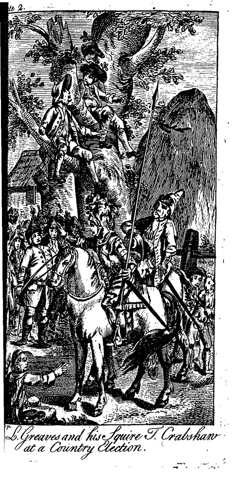 The second illustration for Launcelot Greaves, Sr. L. Greaves and his Squire T. Crabshaw at a Country Election, by Anthony Walker.