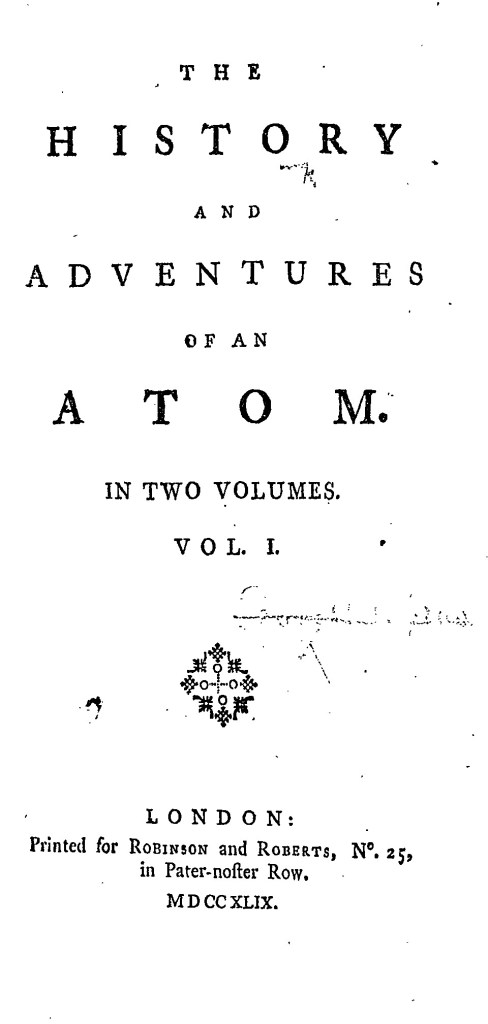 The Adventures of an Atom, as an example of ‘it-narrative’ or ‘object-narrative,’ that is a kind of narrative told by a non-human narrator, is narrated by an atom which/who dictates its adventures to a London haberdasher in whose brain it is lodged. The author portrait takes the form of a printer’s ornament resembling an atom.